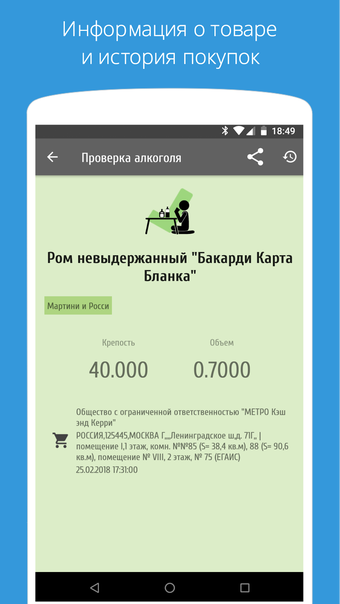 AlcoScan kommer att kontrollera data i databasen för EGAIS hos Federal Service for Alcohol Market Regulation (FSAPR). Om data i databasen matchar informationen från streckkoden visas informationen på skärmen.